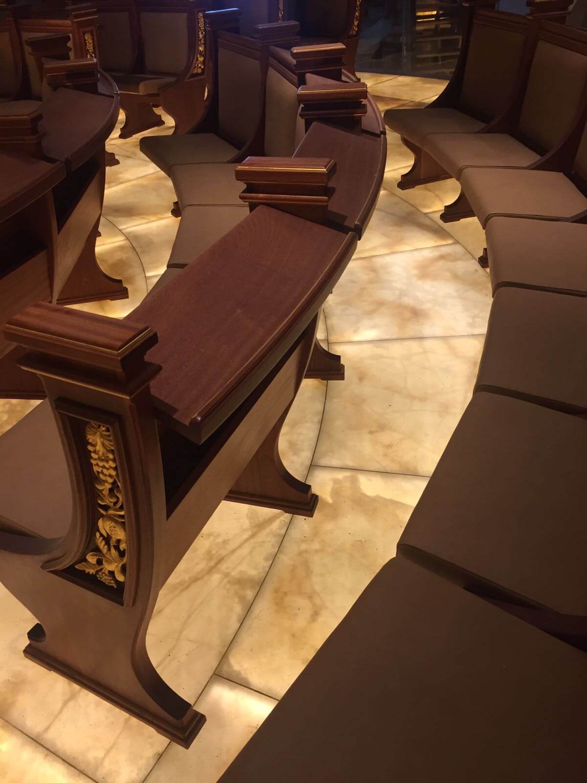 This ambitious project unfolds over 500 sqm of backlit flooring in White Onyx Alabaster Gold placed underground in a humid environment. It is a floating, waterproof, and unexpected floor. The project is completed with laminated glass applied with technical features for public spaces and with high weight capacity and non-slip finish.